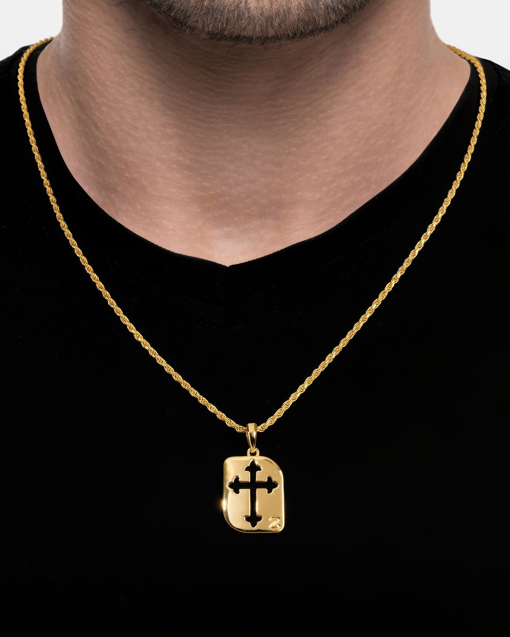 The Gold Cross Cut Tag Pendant radiates modern luxury through its angular cross motif and warm golden glow. This bold yet refined piece transitions effortlessly from day to night, offering design with urban edge for those who appreciate style.