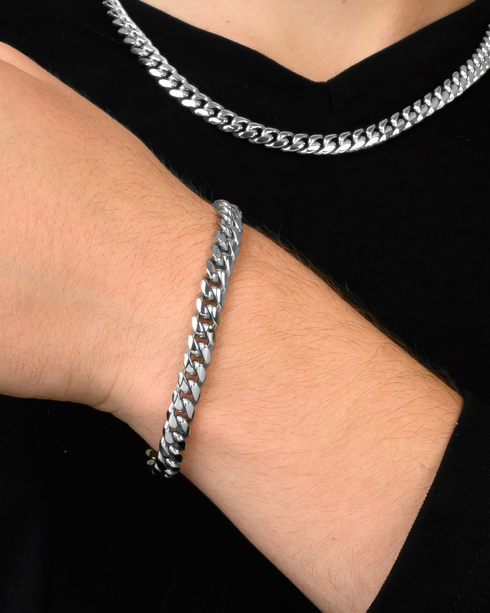 Turn heads with our Silver 8mm Cuban Link Set. Bold yet refined, each piece is crafted for solid weight, smooth polish, and all-day comfort. Whether the chain and bracelet are worn together or separately, this standout set adds a modern, masculine edge to any fit. A must-have for those who want shine without the flash. If you lean more to wanting to be noticed, check out our Gold 8mm Cuban Link Set.
