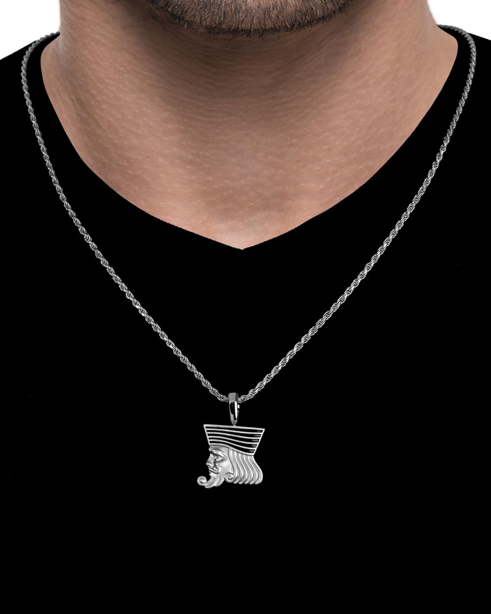 The Silver King Head Pendant commands attention with its polished sterling silver finish and majestic silhouette. Expertly crafted from premium materials, this regal piece rests comfortably against the skin while making a powerful style statement. Wear it as a bold solo piece or layer with complementary chains for added impact. For a classic twist, try our Gold King Head Pendant.