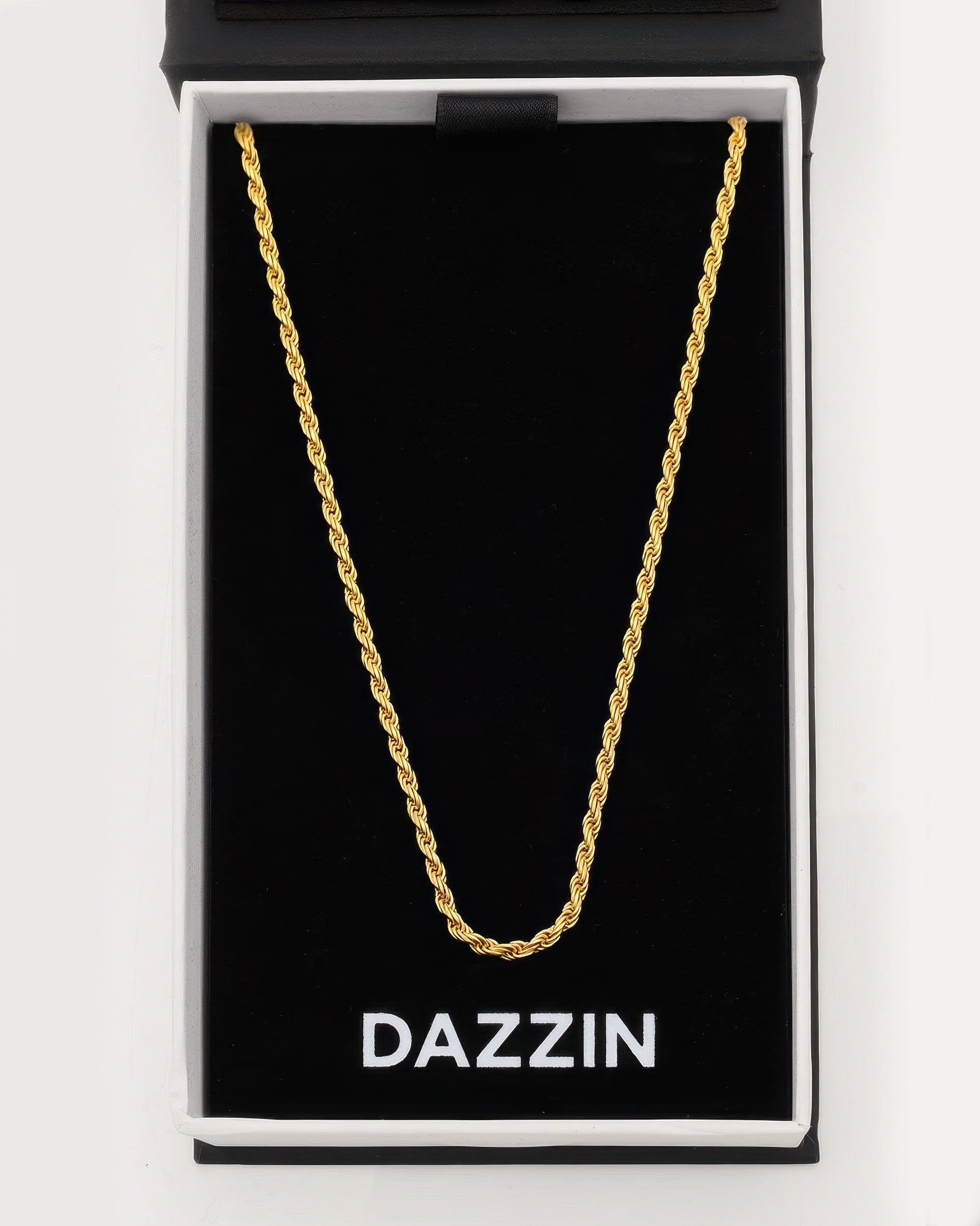 Crafted to shine, the 2.5mm Gold Rope Chain features precision diamond-cut links that catch the light from all directions. Lightweight and adaptable, this chain enhances your look whether worn solo or layered with others. Elevate your collection with the timeless appeal of the Gold Rope Chain.