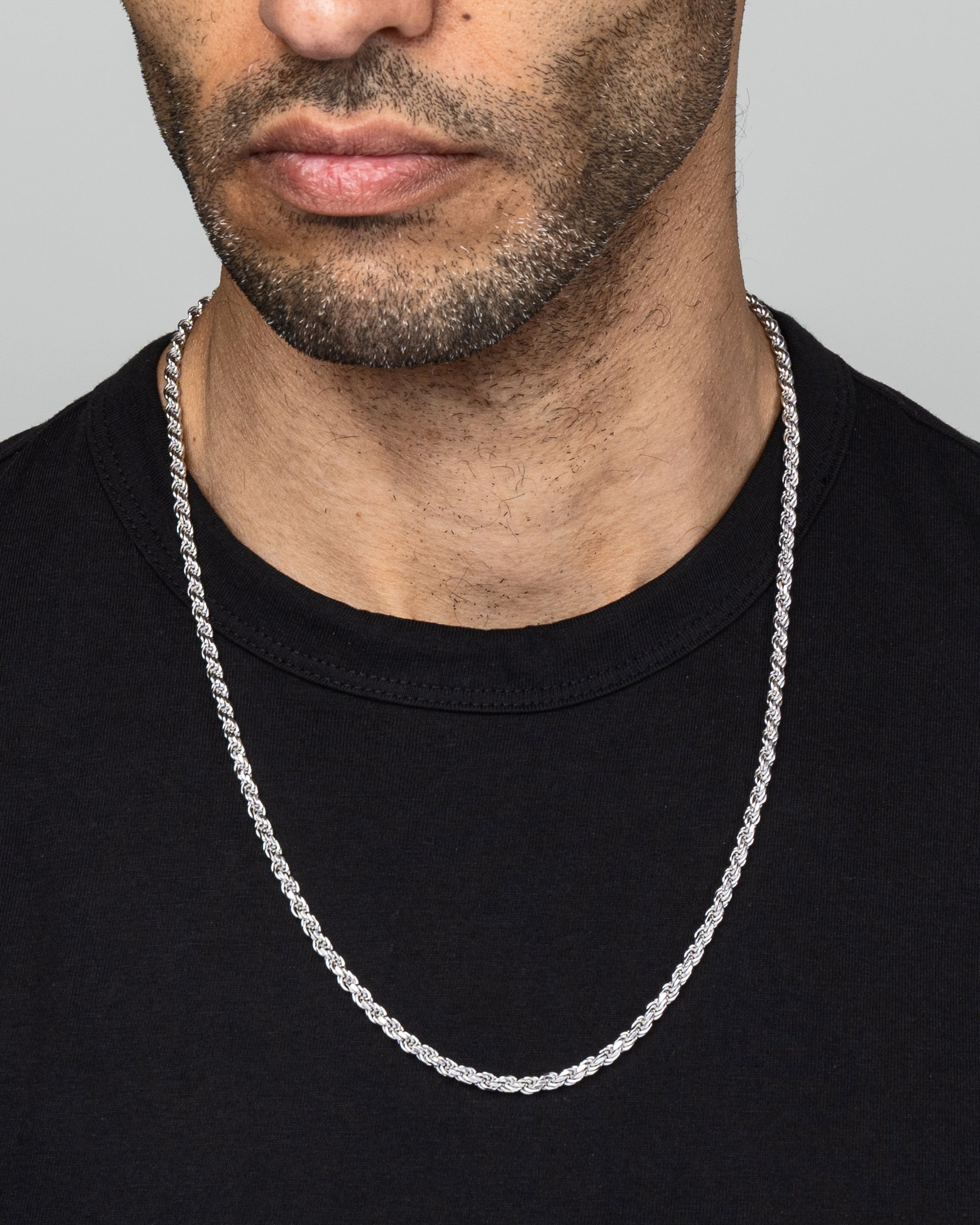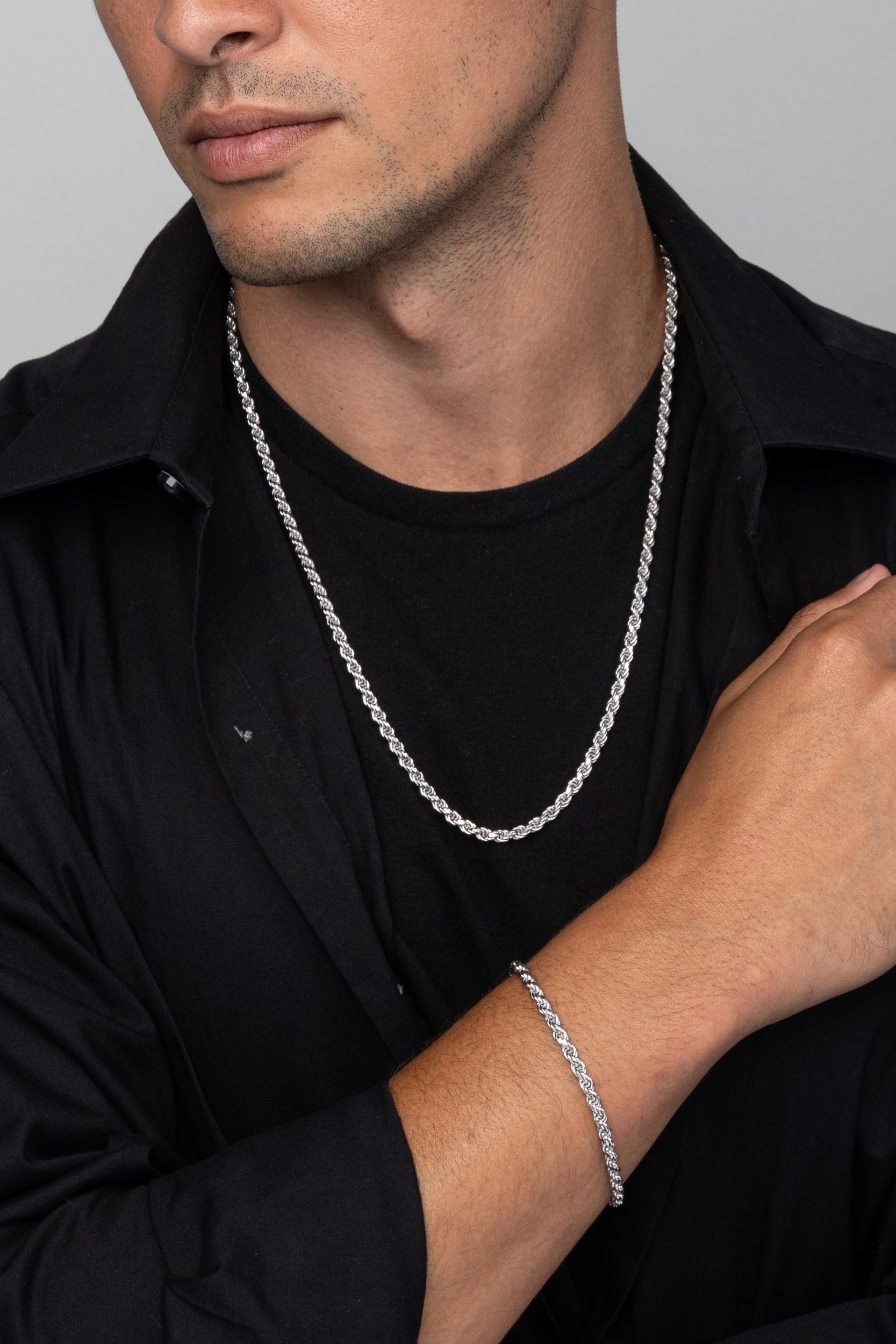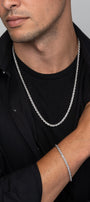 Our 4mm Silver Rope Set features a top-rated Rope Chain and matching Bracelet, both crafted from premium 925 sterling silver. With precisely diamond-cut links that catch and reflect light, this set delivers lasting brilliance and durability. Its timeless rope design offers bold style with every day wearability. Wear them together for a sleek look, or separately to elevate any outfit. For a more elegant style, try our 4mm Gold Rope Set.